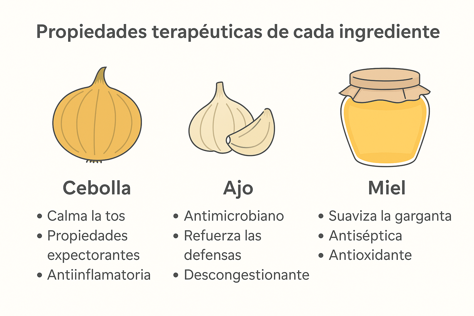 Característica | Jarabe natural de cebolla, ajo y miel | Jarabe farmacéutico común |